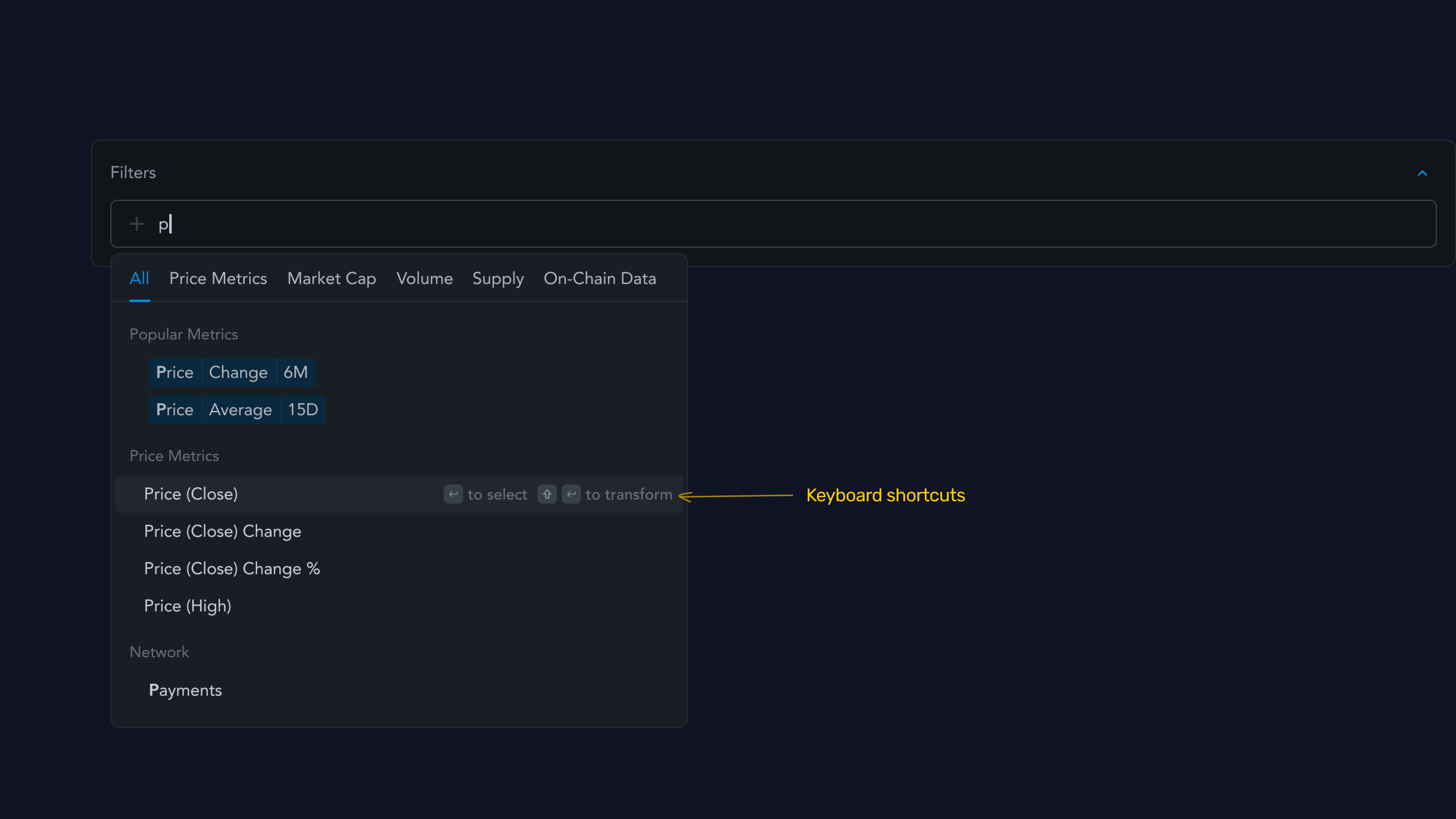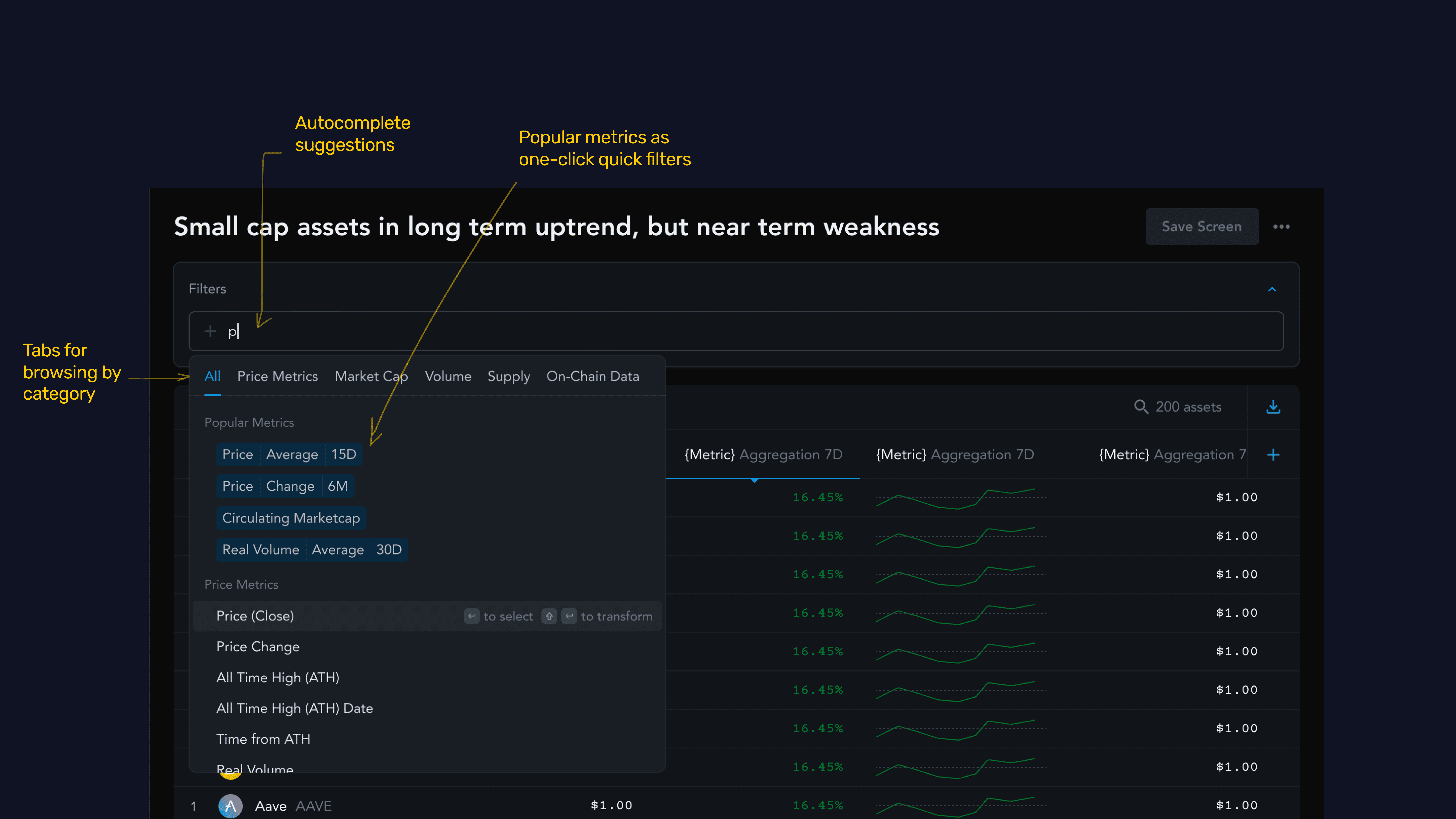 To keep browsing the large data catalog manageable, I created multiple ways to search — via category tabs, quick select popular metrics, and autocomplete suggestions when you type.